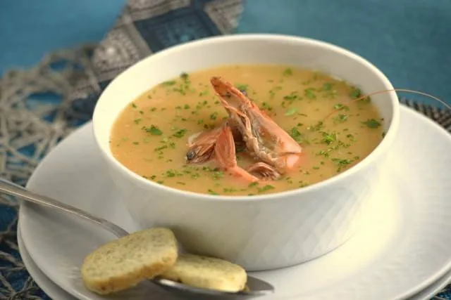 Numa panela, coloque o azeite, as cabeças de camarão e os legumes anteriores, leve ao lume e deixe cozinhar. Adicione depois 2 L de água e deixe cozer. Depois triture muito bem, passe pelo coador de rede e coloque novamente na panela.