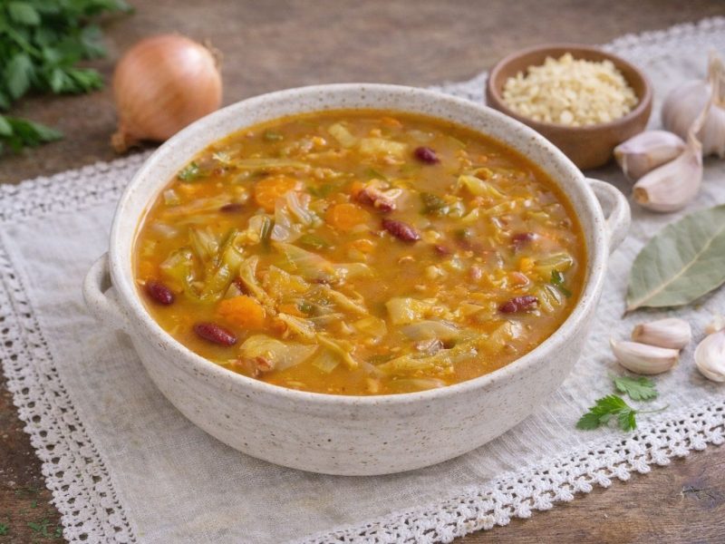 Assim que estiver tudo cozido, retire do lume e passe por um passador de rede, reservando o peixe. Triture o caldo e reserve. Pique o dente de alho restante e refogue-o no azeite. Corte os pimentos em cubinhos e junte-os ao refogado. Desfie o peixe e envolva-o na sopa, juntamente com os pimentos refogados e o arroz. Leve novamente ao lume e ferva durante dois minutos. Retifique o tempero e sirva a canja decorada com coentros.