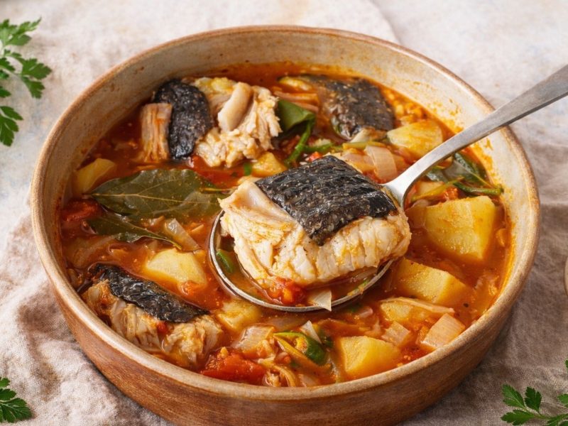 Verti o molho sobre a pescada e em volta coloquei as batatinhas. Levei tudo ao forno e deixei cozinhar (o tempo depende de cada forno, no meu foram necessários uns bons 45 minutos!). Nos últimos 10 minutos, adicionei os camarões e mexi até ficarem bem cobertos pelo molho.