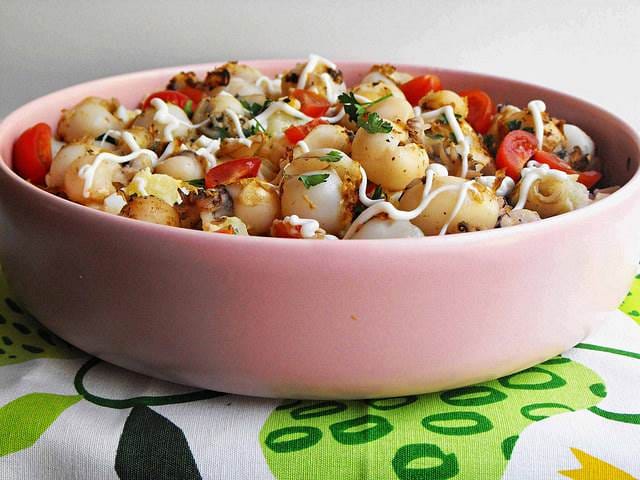 Juntar a maionese às batatas e envolver bem de forma a espalhar por todos os ingredientes. Por cima distribuir os choquinhos grelhados e salpicar de salsa picada.