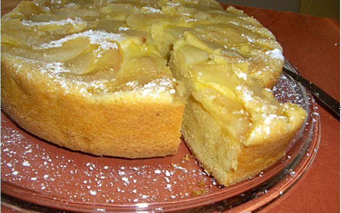 4. Untar uma forma com margarina e farinha e dispôr no fundo as pêras cortadas em meias-luas.
