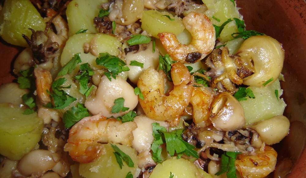Descasque os camarões, dê-lhes um golpe nas costas e retire a tripa. Coloque os chocos, os camarões e os alhos picados numa travessa. Regue com o vinho, tempere com sal e pimenta. Junte também azeite.