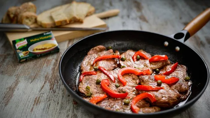 Deite a restante Vaqueiro na frigideira, adicione o cubo Knorr molho de mostarda e o líquido da marinada. Mexa até dissolver o cubo e deixe levantar fervura.