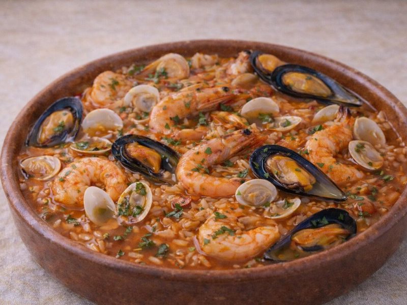 Num tabuleiro de ir ao forno deite o arroz e por cima disponha os pedaços de carne e os enchidos cortados aos pedaços por cima do arroz. Leve a forno pré aquecido a 180º, até dourar a carne e o arroz.