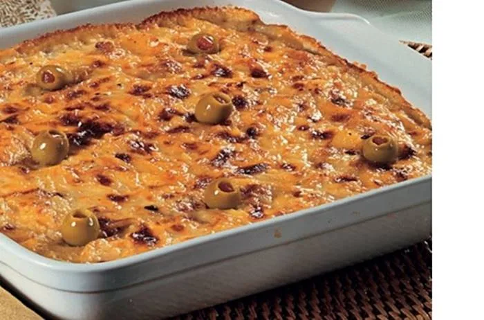 Acrescente-as ao preparado do frango, envolva e junte o molho bechamel. Leve ao lume, adicione as natas, envolva bem e deixe ferver. Coloque o preparado num recipiente refratário e leve ao forno, a 200° C, a gratinar. Decore com as azeitonas e sirva.