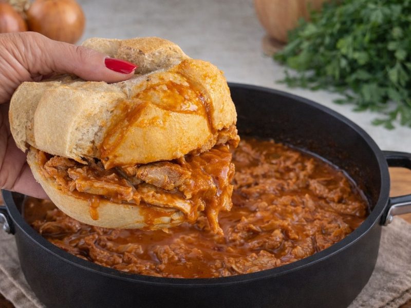 coloque as batatas em volta, regue com o vinho e o azeite. Polvilhe tudo com o colorau e leve ao forno, a 190.º C, cerca de 30 minutos. Retifique os temperos e sirva com coentros.