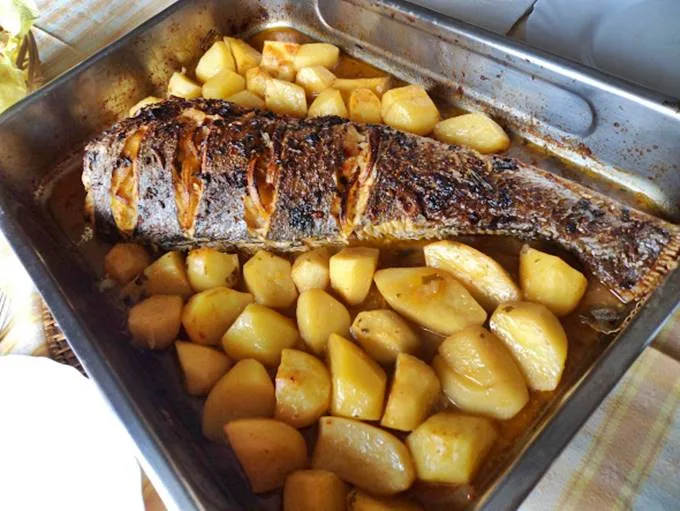 Notas: Se necessário acrescentar mais um pouco de água ao tabuleiro de modo a evitar que as batatas e o peixe sequem demasiado.