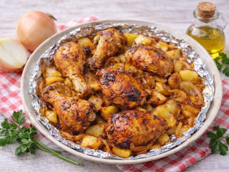 Pernas de Frango no Forno com Batatinhas e Tomate Cereja