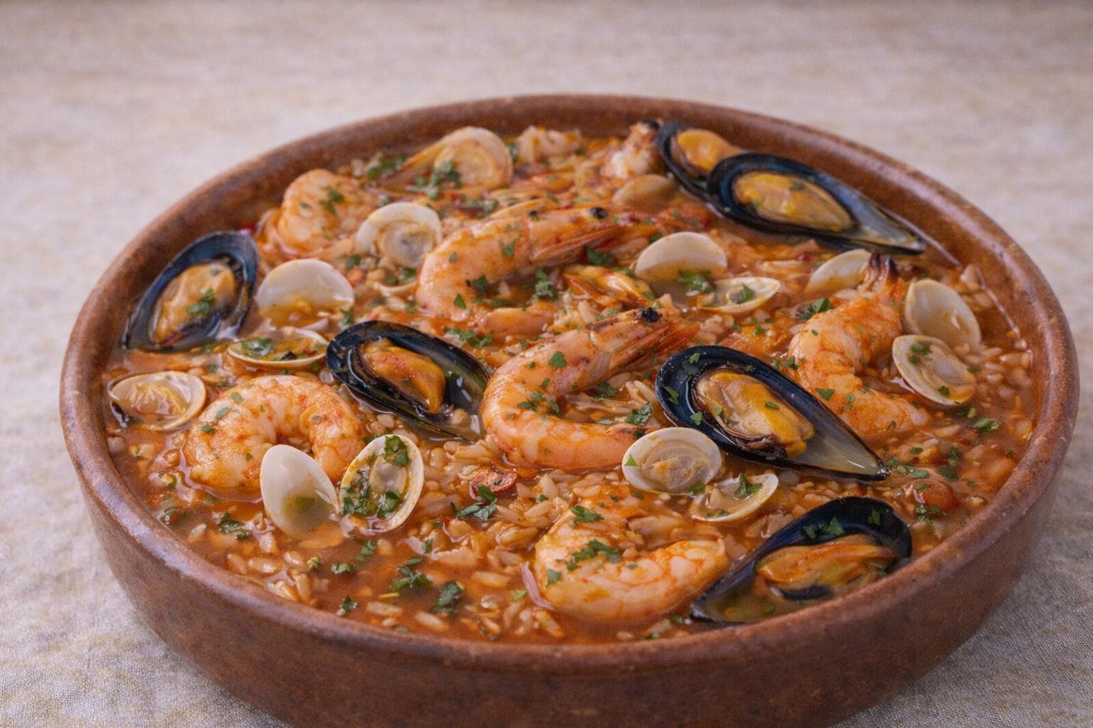 Ingredientes – Arroz: 15 camarões inteiros calibre 20/30; 400 g de amêijoas frescas; 1 kg de mexilhões frescos; 400 g de arroz de grão curto; 5 colheres de sopa de azeite extra-virgem; 1 cebola grande em cubos; 1 pimento vermelho pequeno em cubos; 3 tomates maduros sem sementes em cubos; 5 dentes de alho; 1 colher de sopa de concentrado de tomate; vinho branco seco q.b.; 1 folha de louro; sal e pimenta-preta q.b.; coentros frescos q.b.