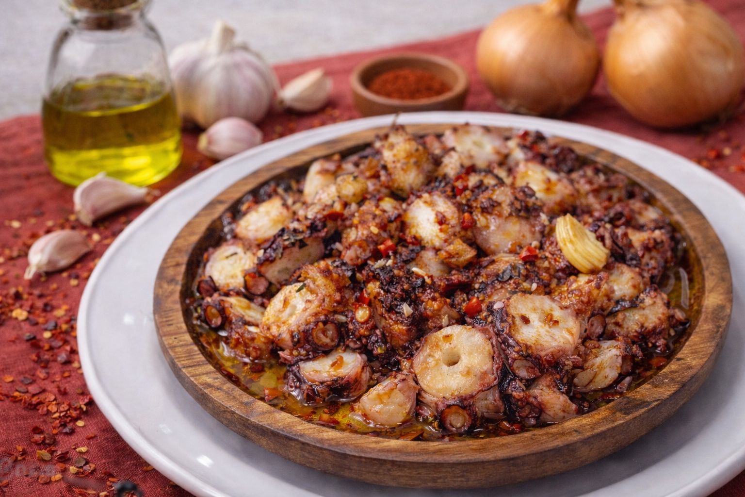 Ingredientes: 1 polvo cozido; 1 cabeça de alhos; 1 malagueta; 2 folhas de louro; azeite q.b.; coentros q.b.; 1 colher de chá de pimentão-doce