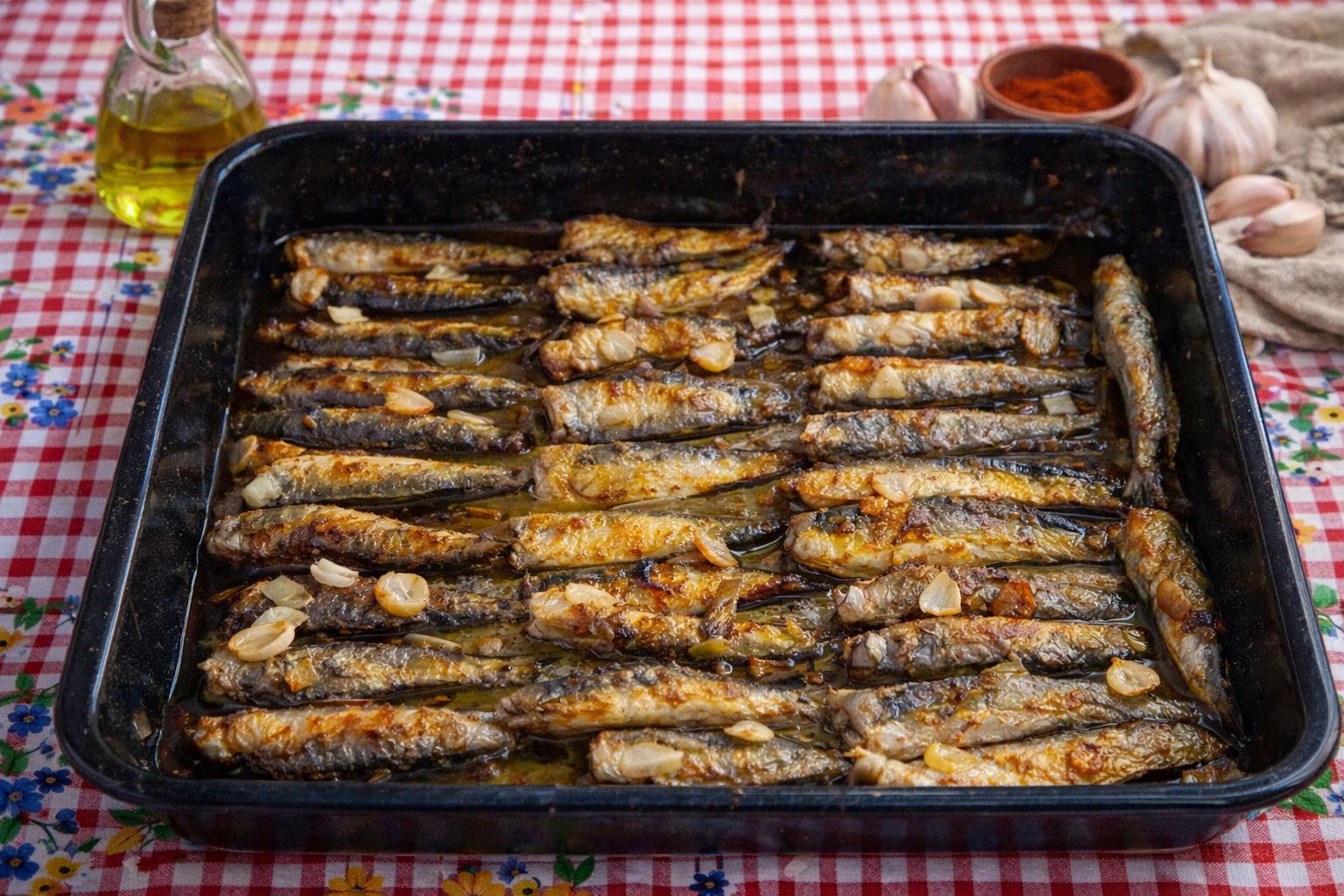 Ingredientes: 1 kg de sardinhas pequenas; 6 dentes de alho; azeite q.b.; pimentão-doce q.b.; 2 folhas de louro; sal q.b.; farinha de trigo q.b.; vinagre q.b.