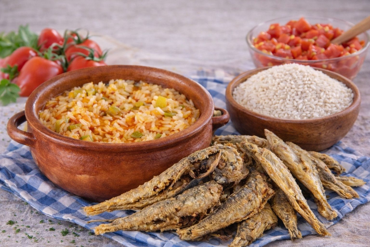 700 g de jaquinzinhos; 350 g de arroz carolino; 400 g de tomate em pedaços; 1 pimento verde; 1 cebola; 6 dentes de alho; 50 ml de azeite; 1 folha de louro; Farinha de milho q.b.; Óleo q.b.; Sal e pimenta q.b.