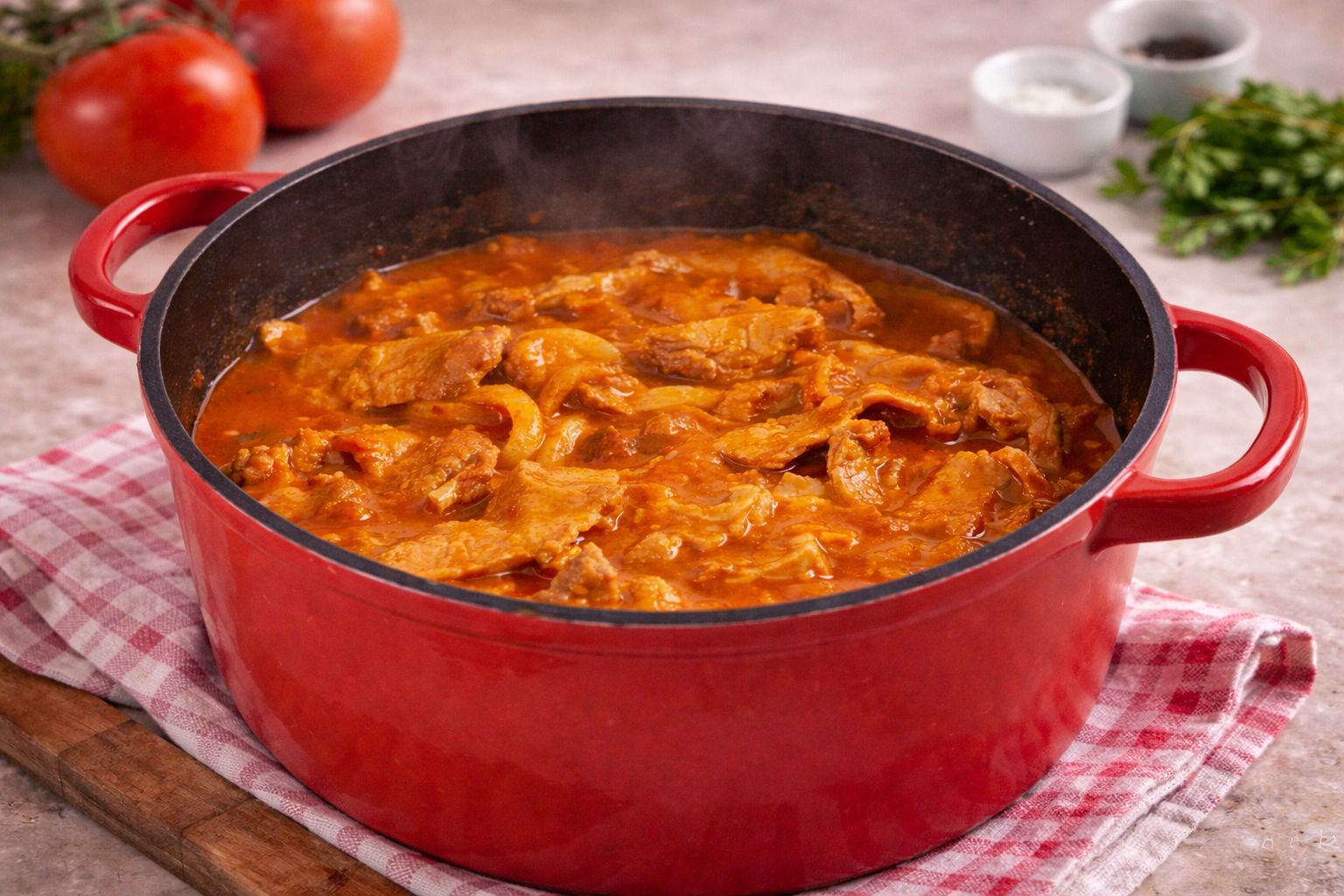 700 g de bifanas de porco bem finas (lombo ou cachaço, bem batidas), 2 cebolas grandes em meias-luas, 4 dentes de alho picados, 2 folhas de louro, 1 colher de sopa de banha, 1 colher de sopa de azeite, 1 colher de sopa de massa de pimentão, 1 colher de chá de colorau, 3 colheres de sopa de polpa de tomate (ou 2 tomates pelados picados), 1 colher de chá de mostarda, 1 colher de chá de molho inglês, ½ colher de chá de cominhos moídos, 150 ml de vinho branco, 150 ml de cerveja (tipo mini), sal q.b., pimenta preta moída na hora q.b., picante a gosto (opcional).